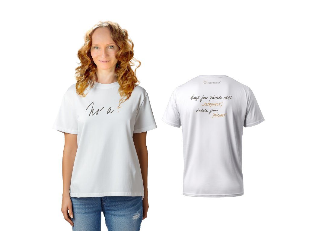 „No a?“ Tahle dvě slova nejsou o lhostejnosti , ALE o osvobození. Od perfekcionismu. Od snahy zavděčit se všem. Od viny, že nejsme pořád „dost“. Tričko „No a?“ vzniklo jako připomínka, že ty sama JAKO UNIKÁTNÍ BYTOST si určuješ hodnotu svého života. Můžeš ho nosit ve chvílích, kdy potřebuješ připomenout, že tvůj hlas je důležitý a že ne každý názor musíš brát vážně.