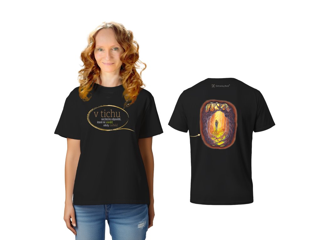 Žijeme ve světě, který pořád mluví. Radí, tlačí, hodnotí, porovnává. Ale odpovědi, které léčí, odpovědi, které jsou pravdivé, ty svět neřekne. Ty přicházejí v tichu. Tohle tričko není výkřik. Je nádech. Je to připomínka, že když ztichneš, slyšíš. Sebevědomí. Směr. Pravdu. Klid.